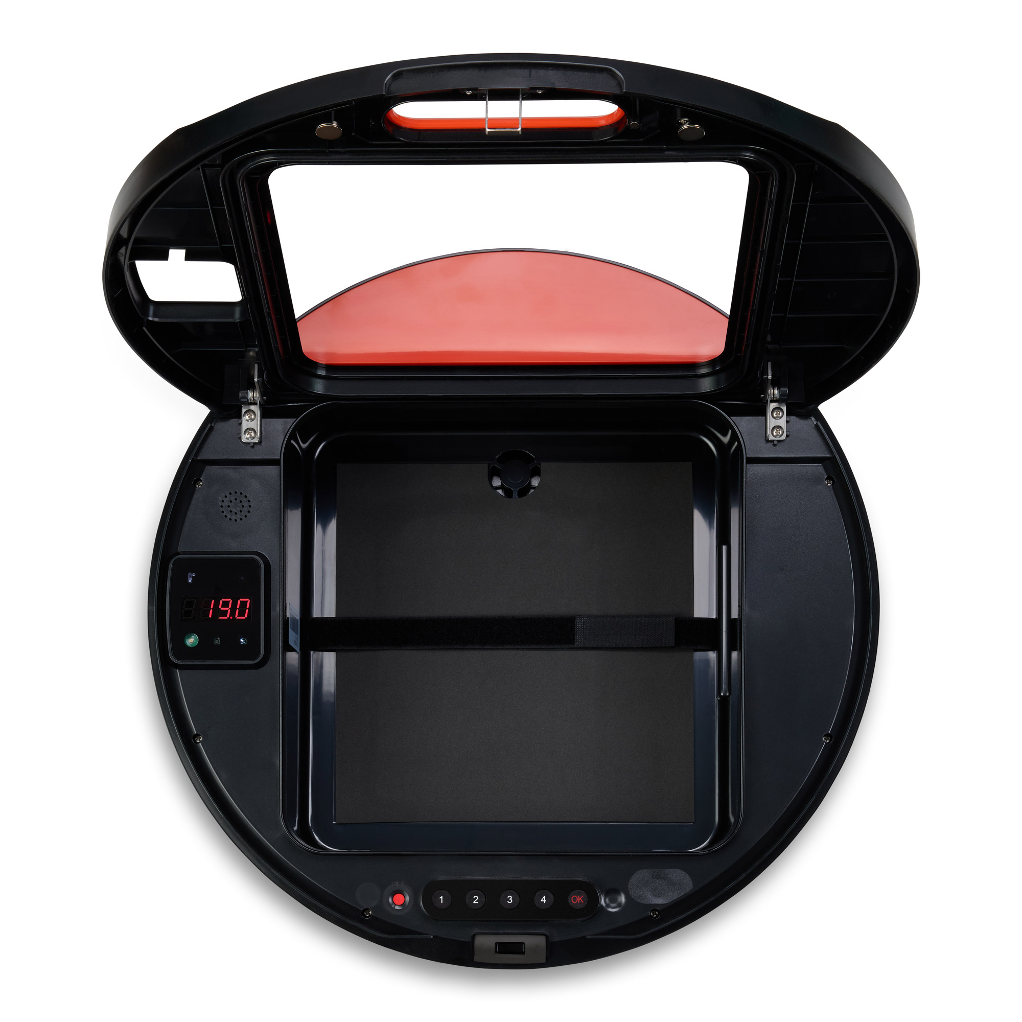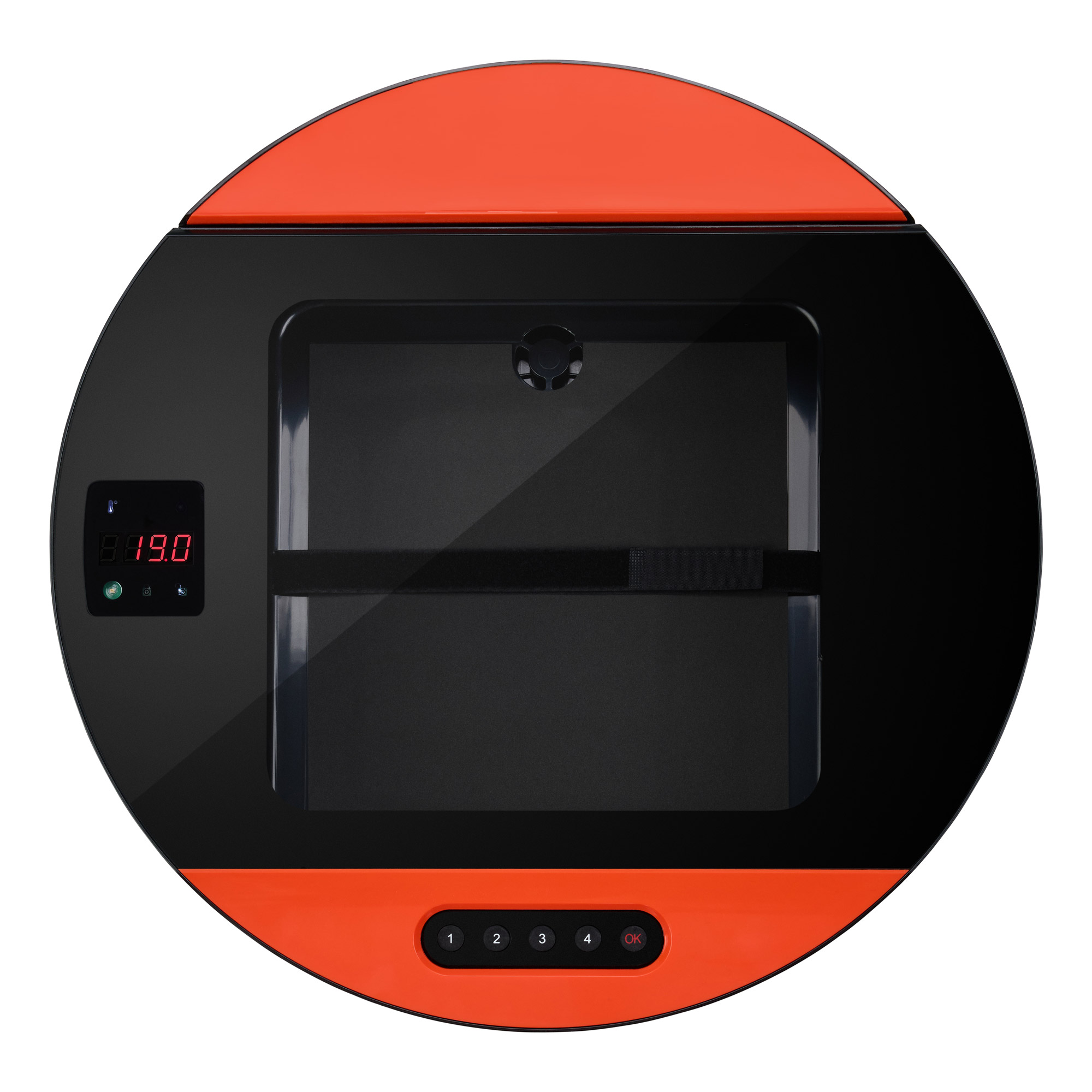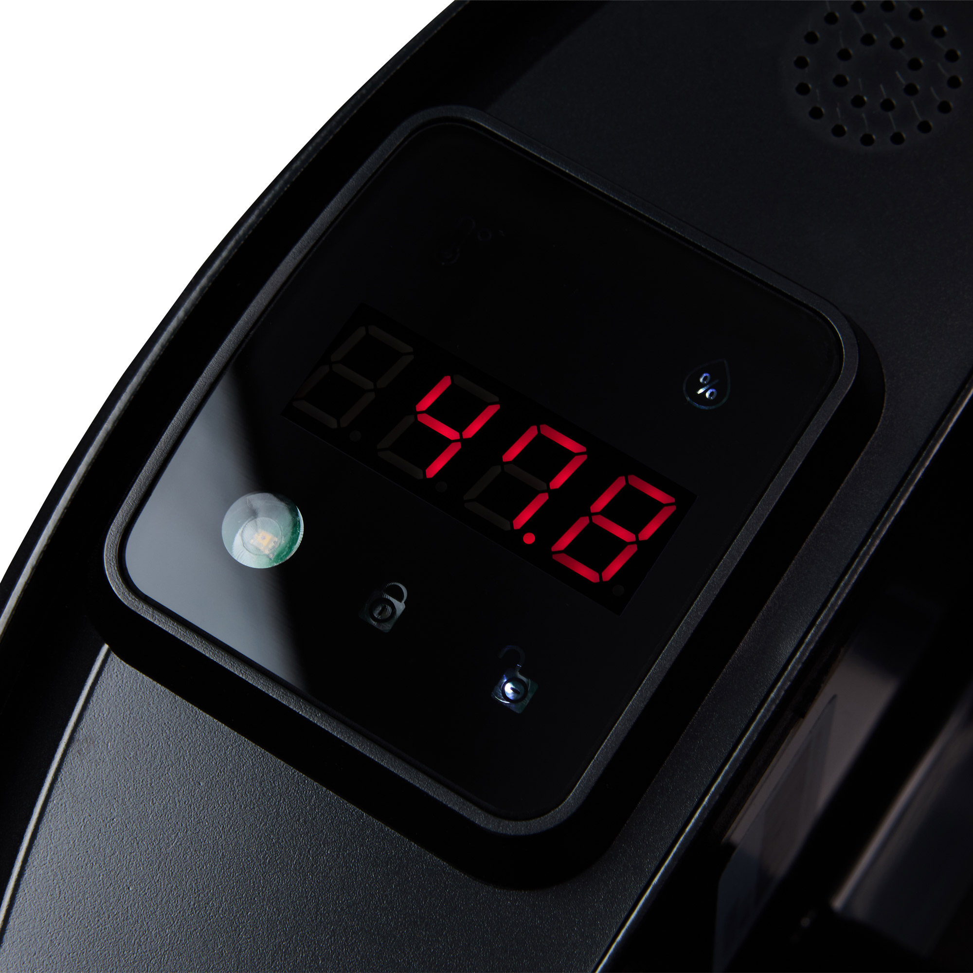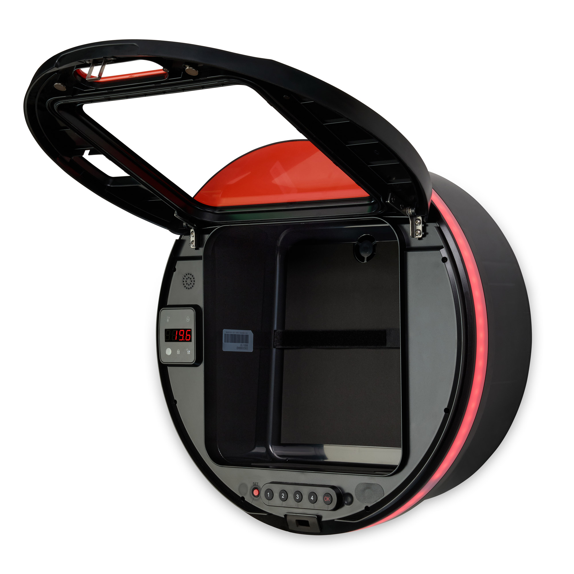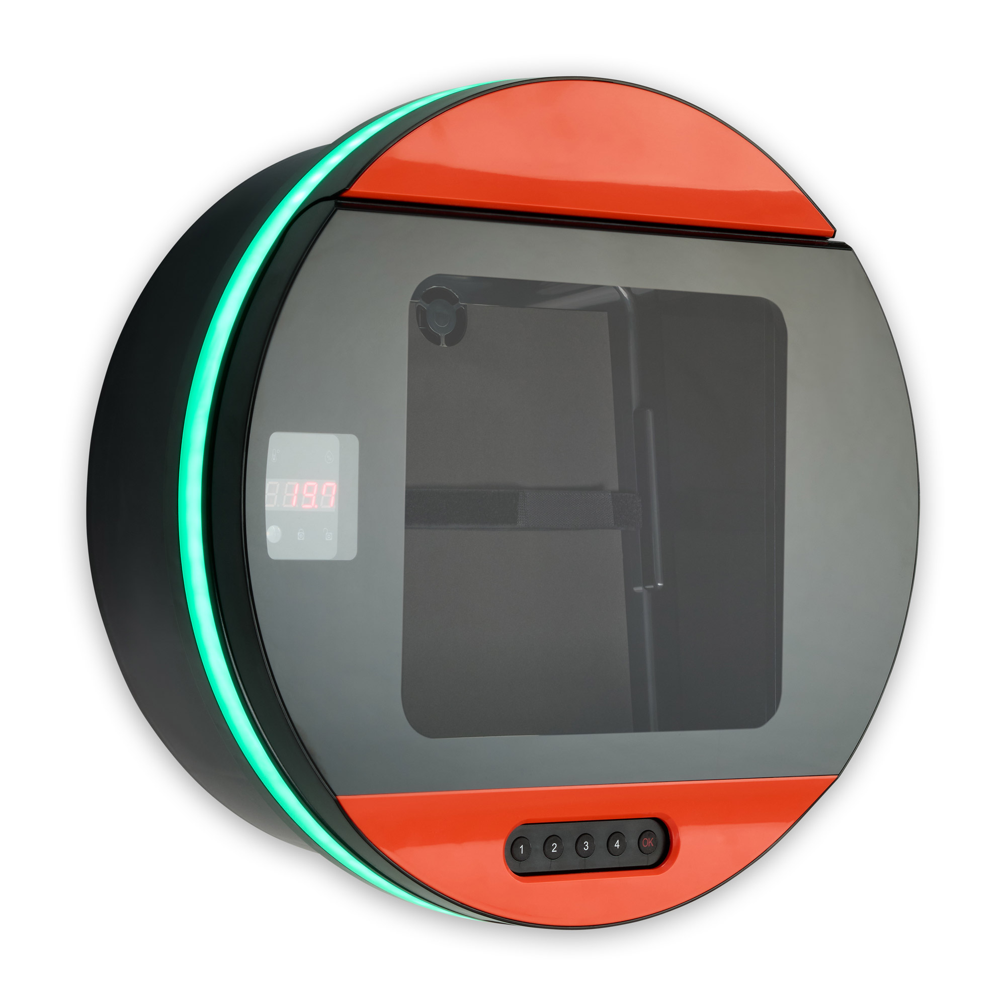 Ein digitales Display zeigt Temperatur, Luftfeuchtigkeit und Türstatus in Echtzeit.